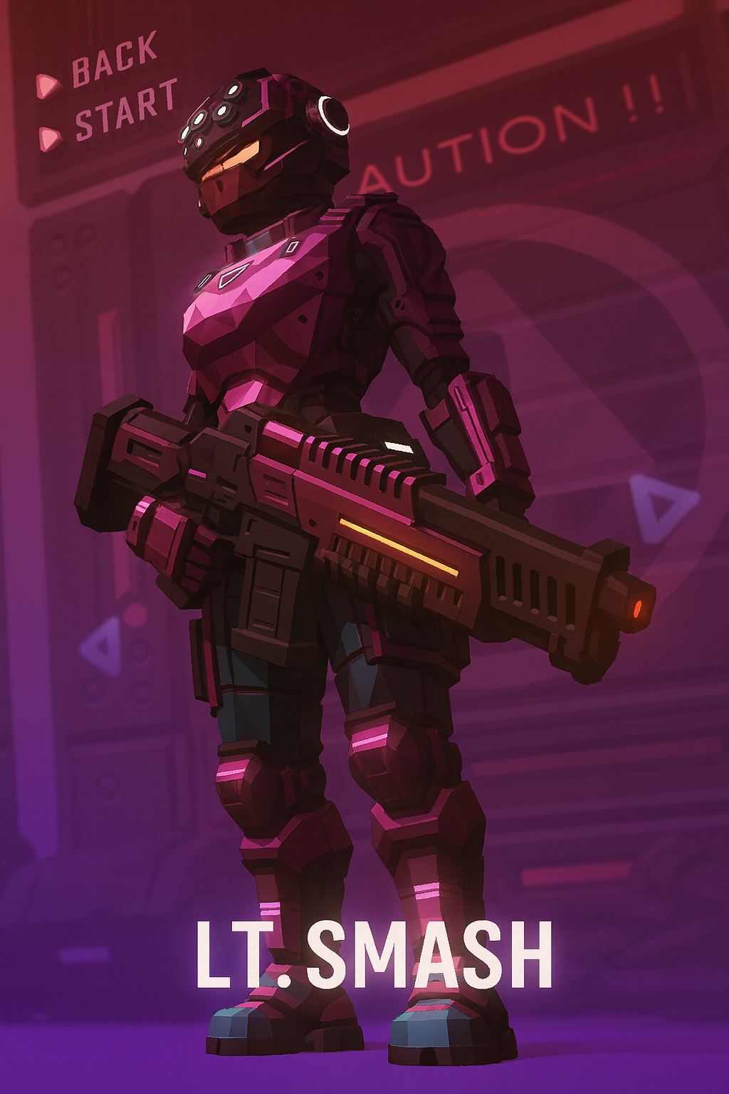 Once a frontline commander for the DDP’s mech divisions, Lt. Smash earned her nickname by turning entire Zombot nests into molten slag. Her reflexes and uncanny battlefield luck make her a whirlwind of destruction. Every pull of her machine gun’s trigger is a calculated storm of lead and fury. She doesn’t just fight—she dominates, trusting her armor and fortune to carry her through where logic says no one survives.