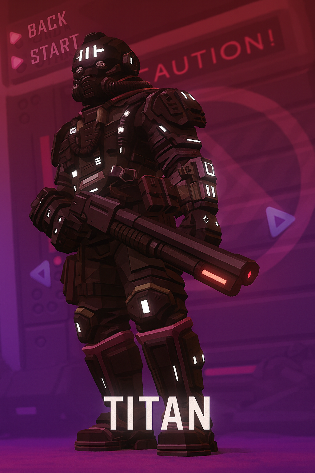 A former industrial enforcer turned battlefield tank, Titan was designed to take punishment as much as he dishes it out. His reinforced exo-armor and adaptive kinetic shielding make him nearly unstoppable on the front lines. When the Zombots swarm, Titan doesn’t flinch—he walks straight through the chaos, each thunderous blast of his shotgun clearing a path for the team. Slow but relentless, he’s the backbone of every mission and the last wall between survival and extinction.